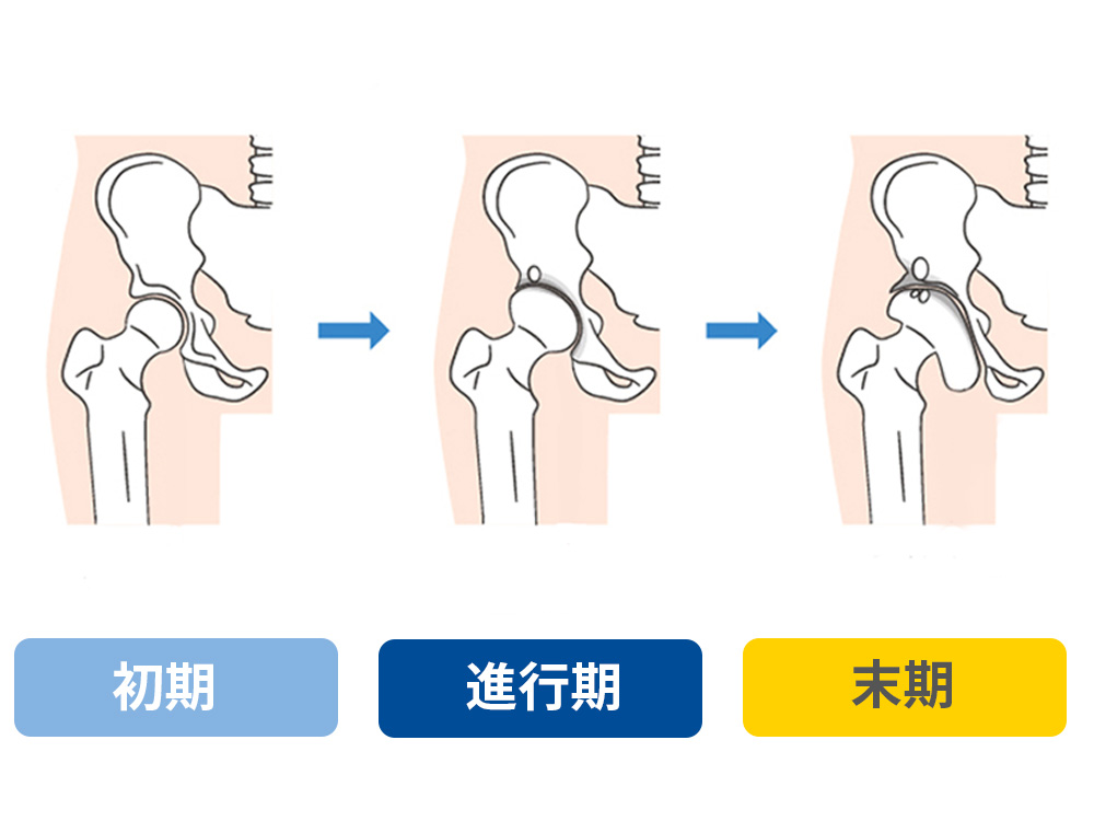 加齢や臼蓋形成不全などが主な原因で、股関節の軟骨がすり減り、骨同士がぶつかることで痛みや動かしにくさが生じる疾患です。中高年の女性に多く見られ、「歩く」「立ち上がる」「階段を上る」など、日常の動作が徐々につらくなっていきます。