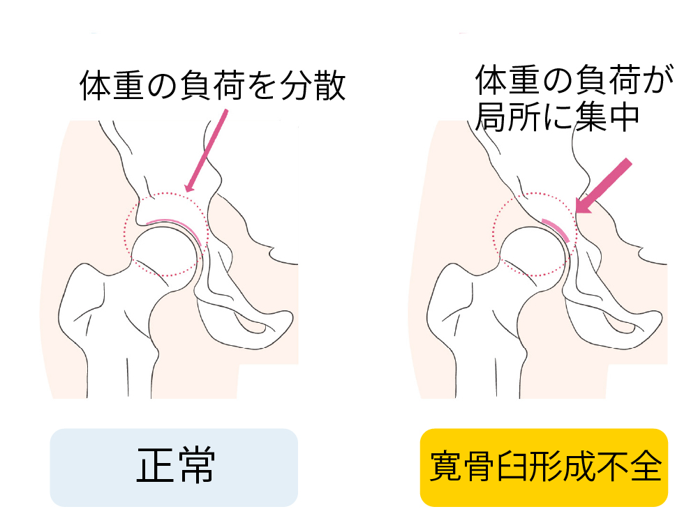 股関節の受け皿(寛骨臼)が浅く、生まれつき関節を十分に覆えていない状態を指します。そのため股関節に負担がかかりやすく、将来的に変形性股関節症へ進行することがあります。